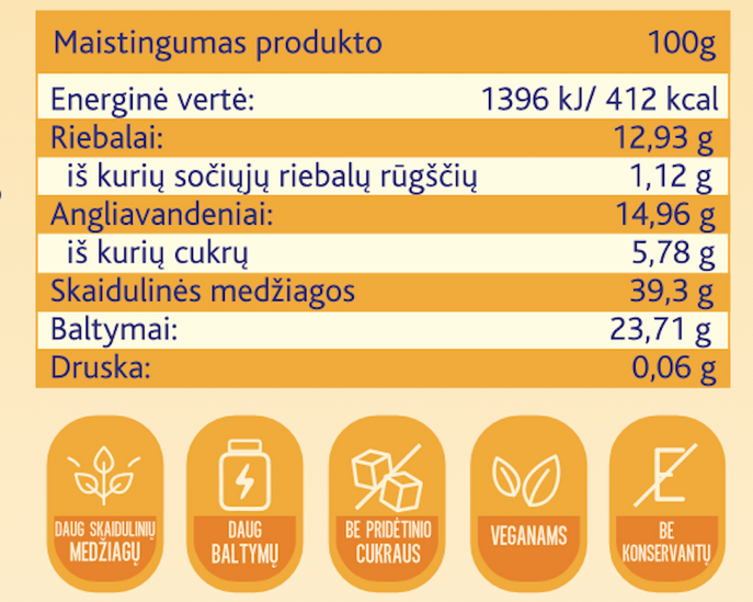 VARTOJIMAS: 1 Šaukštą mišinio sumaišyti su 200 ml jogurto, pasukų, sulčių ar vandens. Leiskite išbrinkti 5-20 min.